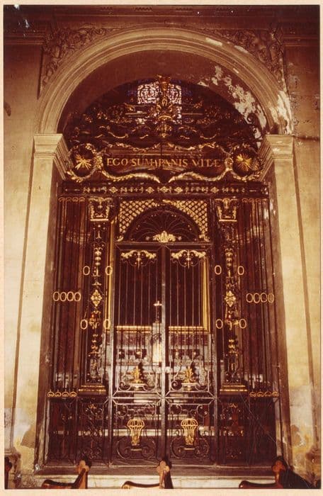 Grille en fer forgé peinte en noir dont certains éléments sont dorés. Elle s'ouvre au milieu par une porte à deux battants. Au faite de cette grille est représenté un calice d'où s'éloignent deux lions.