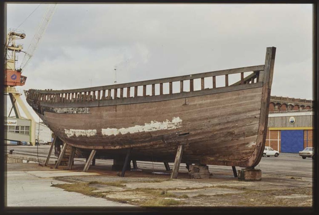 Coque symétrique, large, aux extrémités pincées, fond plat, quille horizontale. Bateau pont présentant une vaste ouverture dans le centre recouverte par des panneaux. Un capian à joues prolonge l'étrave.
