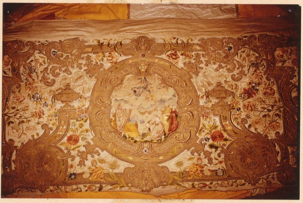 Broderie polychrome et application de fils d'or. Le motif central représente l'Assomption de la Vierge, emportée dans les nuages, sous les yeux des Apôtres.