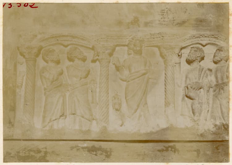 Fragment de sarcophage paléochrétien avec bas-relief encastré.