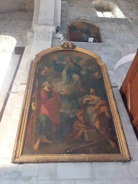 Christ sur un nuage entouré de têtes d'angelots, apparaissant à deux saints situés au niveau terrestre : saint Pierre et saint Jacques le Juste (selon Paulet), saint Jacques le Mineur et saint Philippe (selon l'inspecteur Mottin).
