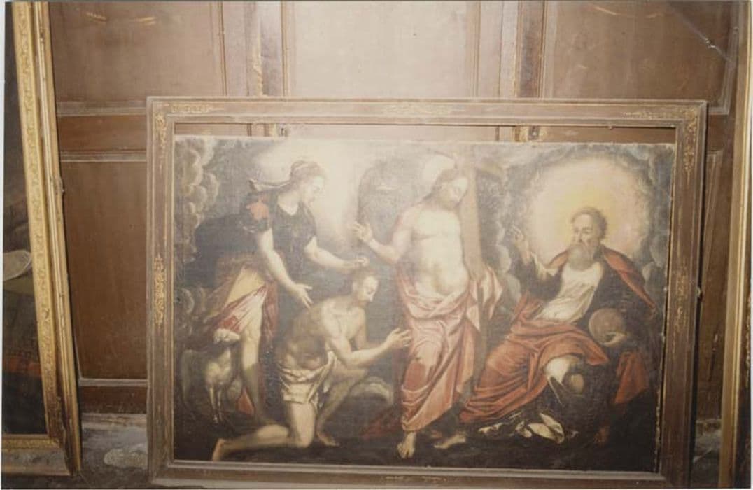 POP | Plateforme ouverte du patrimoinetableau et son cadre : Le Christ ressuscité et une sainte (ou une allégorie) présentent à Dieu le Père un martyr agenouillé (saint Jean-Baptiste ?)