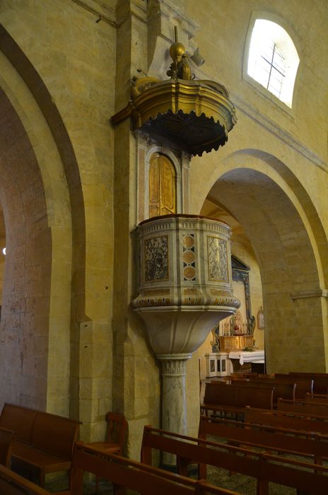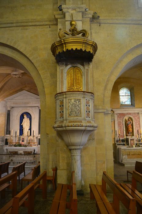 Cette chaire à prêcher est l'oeuvre du sculpteur portugais Emmanuel Carvalho à qui l'on doit également celle de Saint-Trophime d'Arles. Elle remplace une chaire plus ancienne, du 16e siècle, dont il ne reste plus que la porte de l'escalier d'accès aménagé à l'intérieur du massif de maçonnerie.