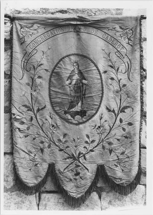 Au recto de la bannière est brodée une Vierge de l'Immaculée Conception, entourée de rinceaux. Au verso, quelques décors floraux avec, au centre, les lettres A et M entrelacées.