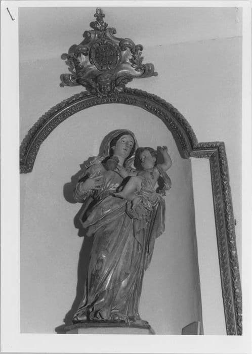 Cadre de statue (Vierge à l'Enfant) en bois peint et doré surmonté d'un cartouche sculpté portant des inscriptions.