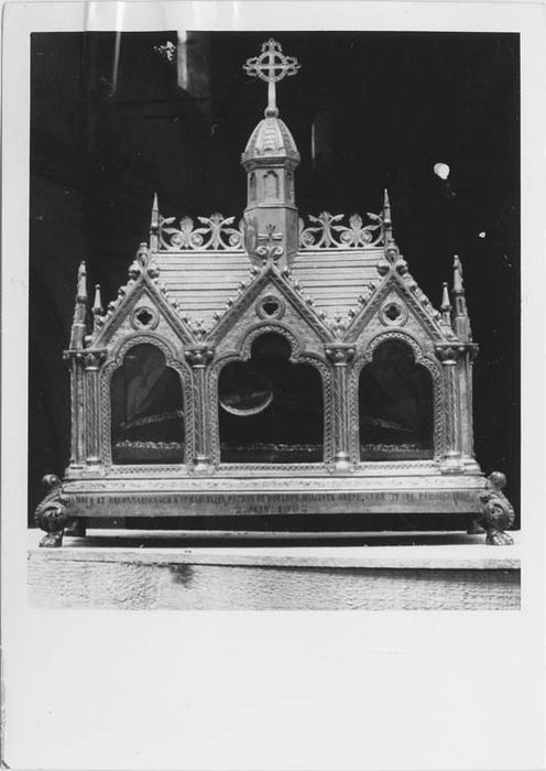 Cette châsse de style néo-gothique a été achetée 210 francs en 1882. Y sont placées des reliques de saint Marcellin obtenues à Rome (d'après le livre paroissial).