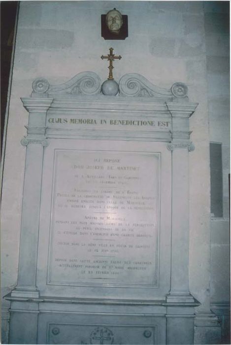 Inscription : Cujus Memoria in benedictione est / Ici repose / Dom Joseph de Martinet / né à Auvillars Tarn-et-Garonne / le 26 décembre 1730 / Religieux de l'ordre de St Bruno / Profès de la chartreuse de Villeneuve les Avignon / envoyé ensuite dans celle de Marseille / où il demeura jusqu'à l'époque de la Révolution / Apôtre de Marseille / pendant les plus mauvais jours de la persécution / au péril incessant de sa vie / il s'épuisa dans l'exercice d'une charité héroïque / décédé dans la même ville en odeur de sainteté / le 12 juin 1795 / déposé dans cette ancienne église des Chartreux / actuellement paroisse de Ste Marie Magdeleine / le 23 février 1856.