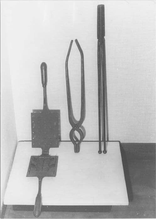 Ensemble d'instruments de chirurgie en fer comprenant : deux bistouris à fourreau, deux sondes cannelées, deux bistouris à lame ouverte, deux pinces, une cautère à bout rond, une cautère à bout carré, deux cautères à bout en olive, une cautère à bout plat, une cautère à bout cylindrique, une pince pour donner les sacrements, une pince pour aspersion, un perce-document pour parfumer, un foyer pour vapeurs antiseptiques, deux pinces de préhension à distance.