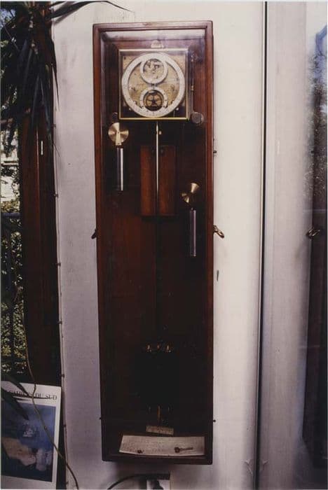 Horloge astronomique fixée par trois vis de fixation réglables et protégée par un caisson amovible à deux poignées. Le caisson est en acajou, seule sa face inférieure n'est pas vitrée. Le balancier en métal se termine par deux masses cylindriques réglables en hauteur. En bas du balancier, sur le support mural se trouve une graduation allant de 0 à 2 de part et d'autre de la verticale. L'horloge est munie de deux poids cylindriques placés de part et d'autre du balancier, et de deux remontoirs. Ces poids sont suspendus par des poulies pleines en laiton. Le mécanisme est lui-même protégé par une cage de verre percée de deux trous pour les remontoirs. Le cadran est en métal découpé, il comporte trois graduations. La principale indique les minutes de 0 à 60 en chiffres arabes de cinq en cinq. Les deux autres graduations, inscrites dans la première, indiquent pour celle du haut les secondes en chiffres arabes et pour celle du bas les heures en chiffres romains.
