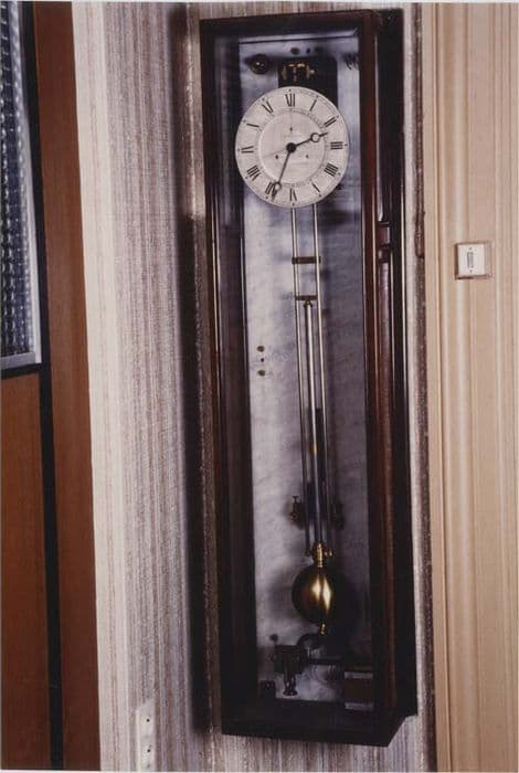 Horloge à balancier dont la tige en acier est munie d'une sphère de laiton à son extrémité inférieure. La sphère de laiton est munie d'un demi-anneau en fer doux auquel un solénoïde transmet une impulsion électrique ; à mi-course du balancier, un autre fer doux passe au-dessus d'un second solénoïde chargé de transmettre les impulsions à une ou des pendules de bureau. Le cadran, gradué en chiffres romains, possède trois aguilles. L'horloge est fixée au mur par une plaque de marbre. La caisse en acajou, vitrée sur trois faces ainsi que sur la face supérieure, est solidaire de l'horloge.