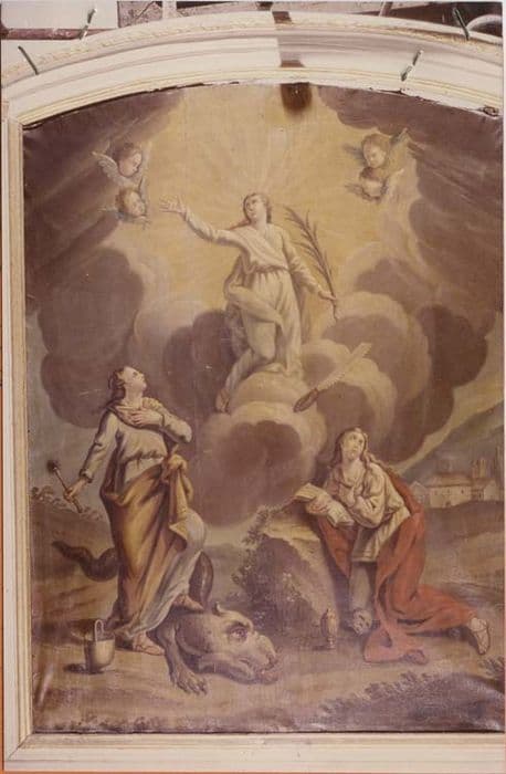 La sainte, entourée de têtes d'angelots, les pieds nus sur les nuages, dans un halo de lumière, tient la palme du martyre dans la main gauche ; devant elle, la scie, instrument de son martyre. A ses pieds, sainte Marthe, le pied gauche sur la tarasque, et sainte Marie Madeleine, tenant l'Evangile ouvert, une tête de mort et une rose de parfum devant elle.