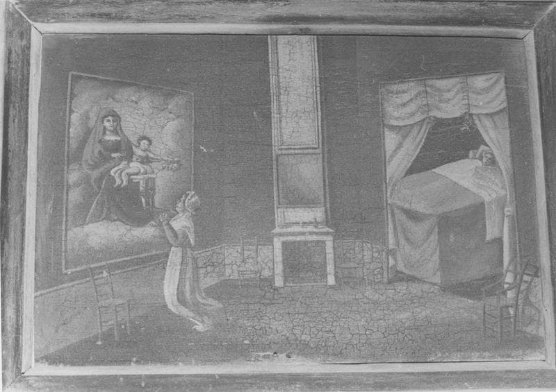chambre : lit, cheminée, chaise ; tableau : Vierge à l'Enfant ; personnage : maladie ; femme : agenouillé, prière