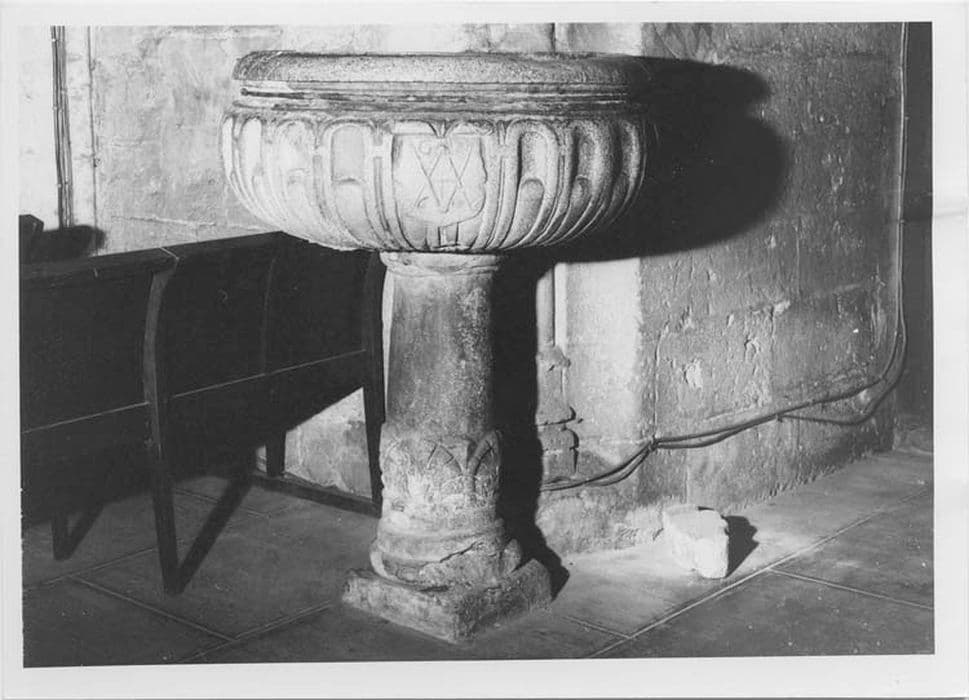 Ce bénitier est orné de cannelures et d'un écu, assez peu lisible, semblant représenter deux compas dont un renversé, avec un marteau et la date. Il doit s'agir d'une marque de tâcheron.
