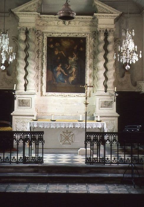 Encadrement central de chutes de fruits issues d'une conque et d'un noeud ; colonnes torses jumelées décorées de feuillage, avec socles ornés de chérubins en camaïeu ; frise avec chérubin et palmettes entrecroisés ; fronton triangulaire coupé ; la partie centrale du couronnement manque.
