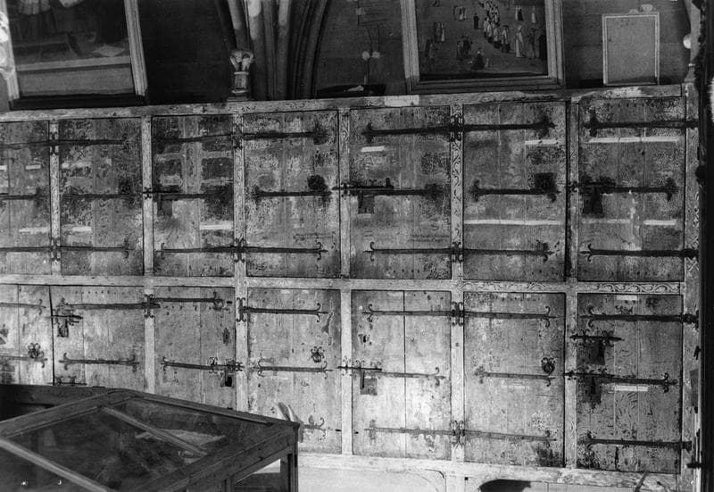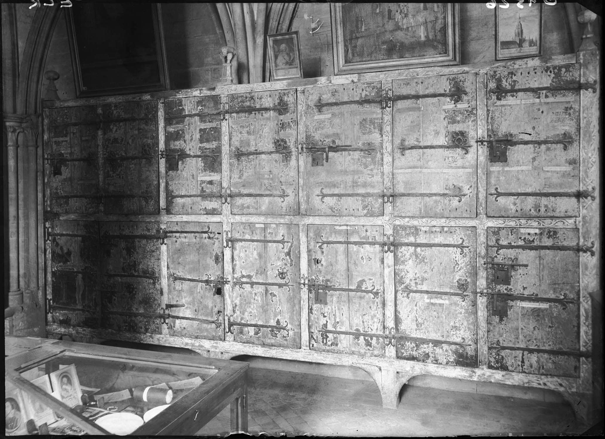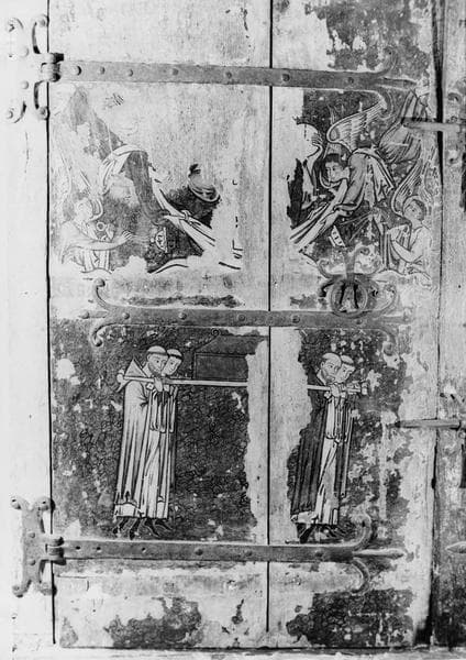Armoire décorée de peintures ; assemblage de panneaux à grain d'orge et faux tourillons ; battant avec le bâti : feuillure sur le bâti ; pentures et serrures à vertevelle