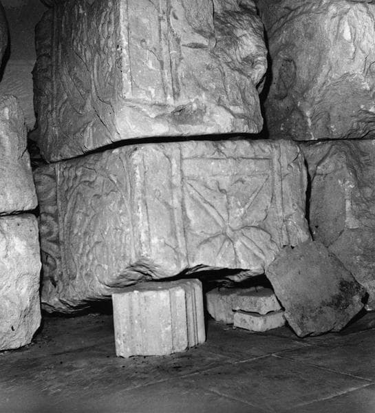 Onze éléments sculptés et trois fragments d'époque gallo-romaine musée lapidaire ; claveau à enroulement de vignes sur la face verticale et fleurs à quatre pétales sur la douelle (INV. 8) ; claveau : vigne avec grappe en faible relief, et bordure de palmettes (INV. 6) ; pierre sculptée sur sa face antérieure : grosse torsade sous une bordure en saillie ; décor végétal sur la douelle (INV. 3) ; claveau à enroulement de vignes en faible relief (INV. 5) ; pierre sculptée, face verticale à enroulement, bordure à palmettes ; claveau avec décor sur la douelle : fleur à quatre pétales découpées entre deux bordures à gros entrelacs (INV. 27) ; torse d'un personnage masculin, avec traces de polychromie ; plaque sculptée à enroulements de vigne (frise ou pilastre) ; fragment de colonnes engagée : moitié inférieure d'un corps d'homme (INV. 25) ; deux fragments superposés d'un chapiteau presque cassé, avec un petit personnage nu sous une sorte d'arc ; plaque sculptée à décor d'enroulement de vigne, soit une frise, soit un pilastre ; partie supérieure d'une colonne Toscane (INV. 23) ; partie supérieure d'une colonne Toscane, mouluration abâtardie ; partie supérieure d'une colonne Toscane