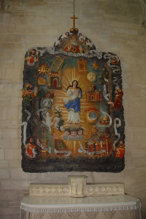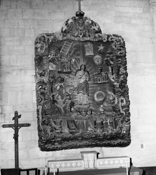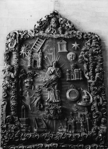 Bas-relief qui provient sans doute d'un retable des litanies de la Vierge ; cadre composé de nuages où apparaissent Dieu le Père et les prophètes.
