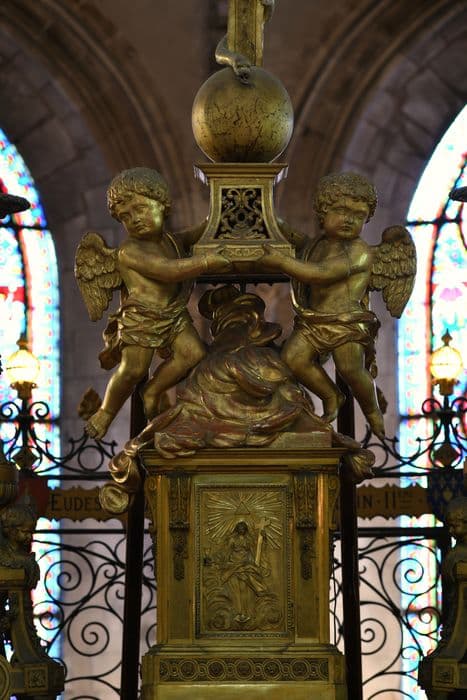 Les chandeliers sont sur le maître-autel ; la croix de bois doré, à amortissements fleurdelisés, est soutenue par des angelots ; un serpent s'enroule à la croix, posée sur un globe