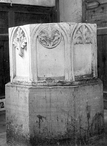 Cuve octogonale ; chaque face présente une fenêtre ogivale dont la partie supérieure est garnie de feuillage.