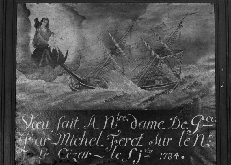 l'inscription occupe un bon tiers du tableau ; transcription : VOEU FAIT A N (O) TRE DAME DE G (RA) CE PAR MICHEL FERET SUR LE N (AVI) RE LE CEZAR LE 5 J (AN) VIER 1784.