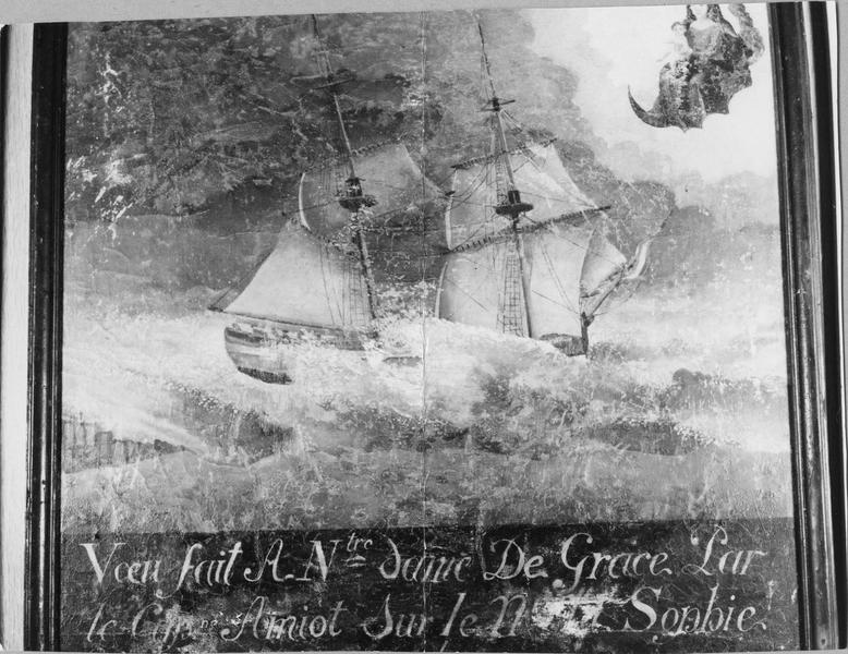 transcription : VOEU FAIT A N (O) TRE DAME DE GRACE PAR LE CAP (ITAI) NE AMIOT SUR LE N (AVI) RE LA SOPHIE LE 10 SEPTEMBRE 1789.
