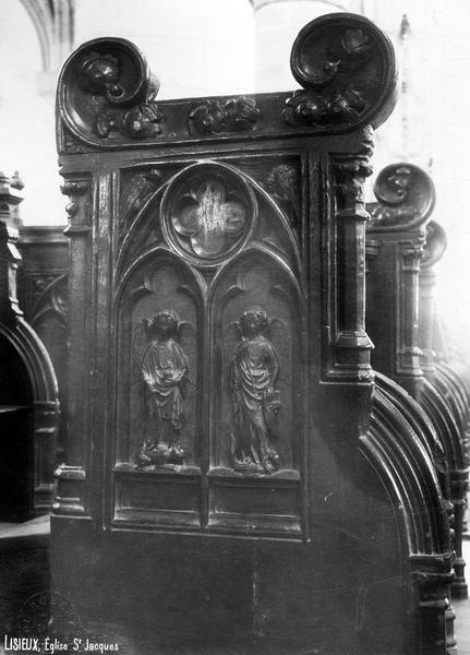 La première moitié du 14e siècle fût plus propice aux embellissements à Lisieux que la seconde moitié du même siècle, très troublée par l'occupation anglaise ; à comparer avec les stalles de Notre-Dame de la roche, en seine et Oise ; les couronnements, mutilés par les protestants, ont été refaits par Jehan Bullet et son fils d'avril à octobre 1562 ; en 1689, on démolit le jubé gothique, déplaça les stalles et les rapprocha du sanctuaire ; c'est peut-être à ce moment qu'on leur mit un dossier