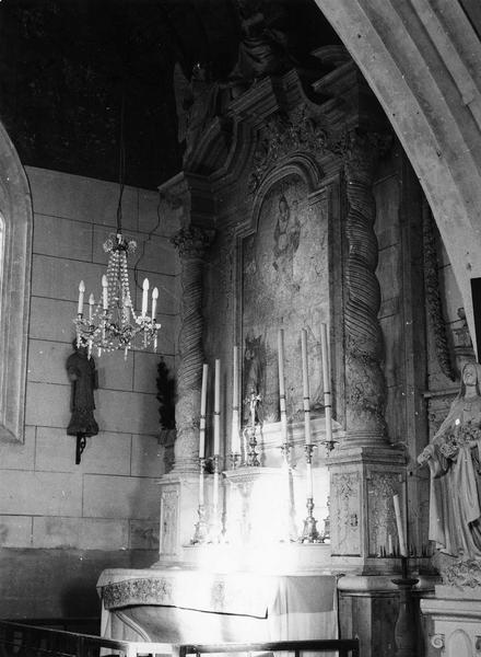 Deux colonnes torses cannelées et décorées de pampres au tiers inférieur supportent une corniche à ressauts, flanquée de départs de fronton ; au sommet, Vierge à l'Enfant entre deux anges.