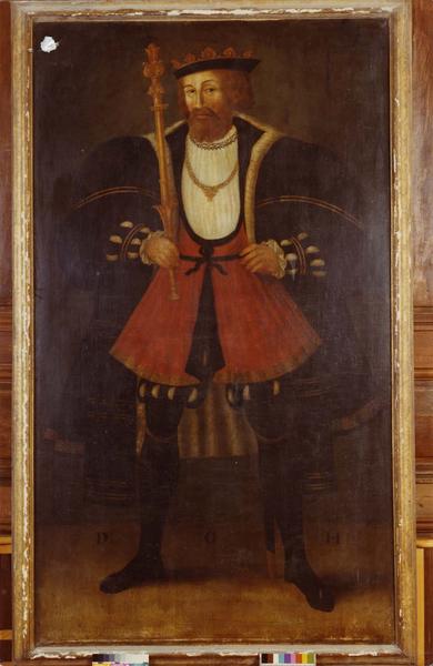 inscription en latin sur la toile, en bas ; traduction M.de Bouard : Les religieux de cette abbaye ont fait copier, en hommage de reconnaissance à leur si généreux bienfaiteur, le portrait authentique de Guillaume duc de Normandie, conquérant et roi d'Angleterre, qui était peint sur un ancien panneau. an 1708. SAINT MARTIN PINXIT.