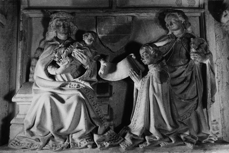 POP | Plateforme ouverte du patrimoinedemi-relief (monument funéraire) : sainte Catherine intercède auprès de la Vierge et de Jésus enfant pour un ecclésiastique
