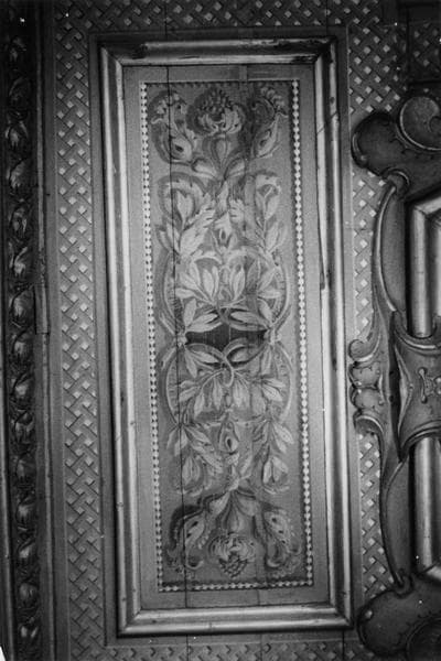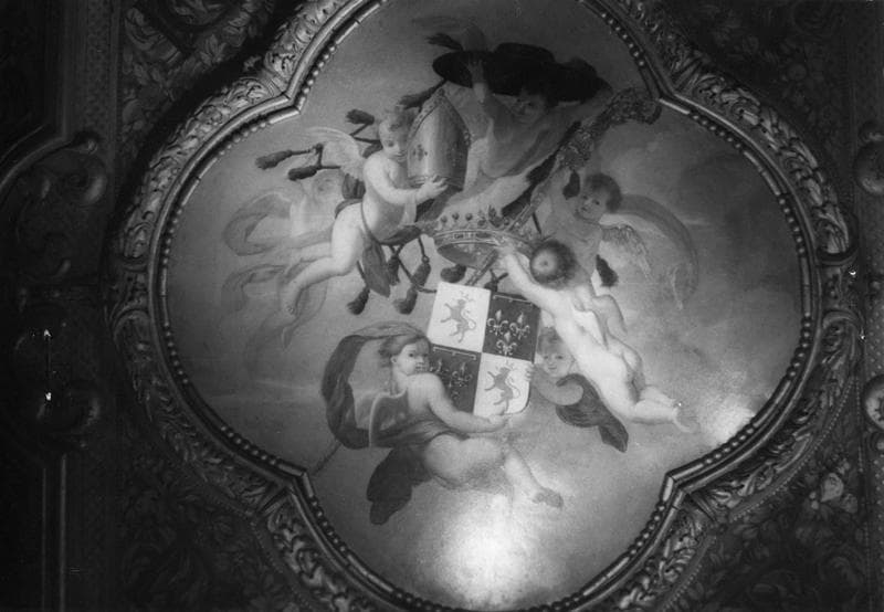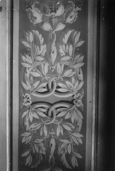 Décors du plafond : ensemble de grisailles décoratives, de scènes représentant : guerriers rentrant en triomphateurs, transport des urnes contenant les cendres de guerriers, sacrifice du boeuf, entretien du feu sacré ; motifs décoratifs en caisson ou en frise, armoiries de Léonor de Matignon, têtes de lions sculptées