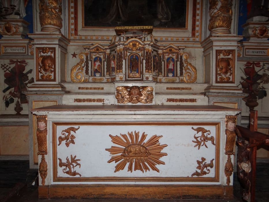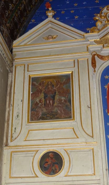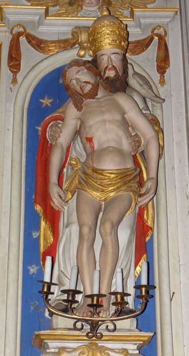 Deux colonnes torses baguées d'une couronne fleurdelisée, garnies de pampres et d'oiseaux picorant, soutiennent une corniche arrondie au-dessus d'un Chérubin ; en haut, deux départs de fronton à enroulements sur lesquels sont posés des anges encadrent un panneau figurant le Saint-Esprit et coiffé d'un fronton triangulaire ; côtés étroits