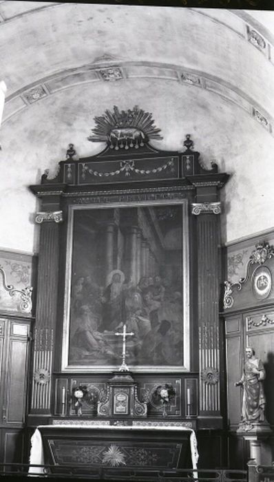 Pilastres ioniques ; attique terminal bas décoré de guirlandes et sommé d'une gloire entre des urnes.