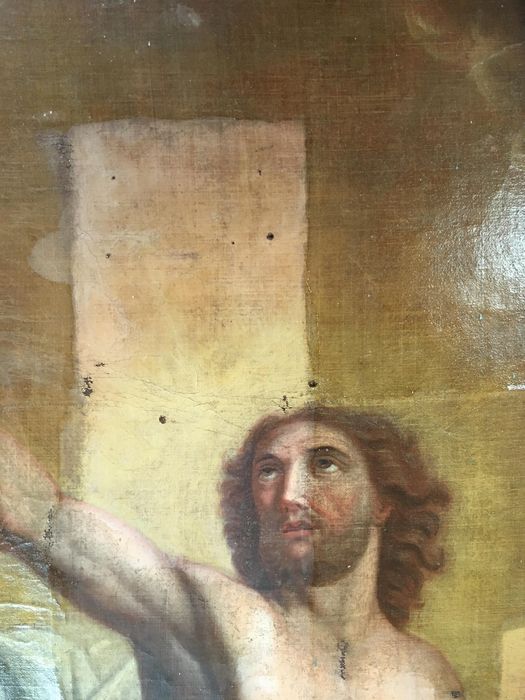 Déchirure dans le haut ; Petit trou au centre ; baguette clouée sur le pourtour de la surface peinte
