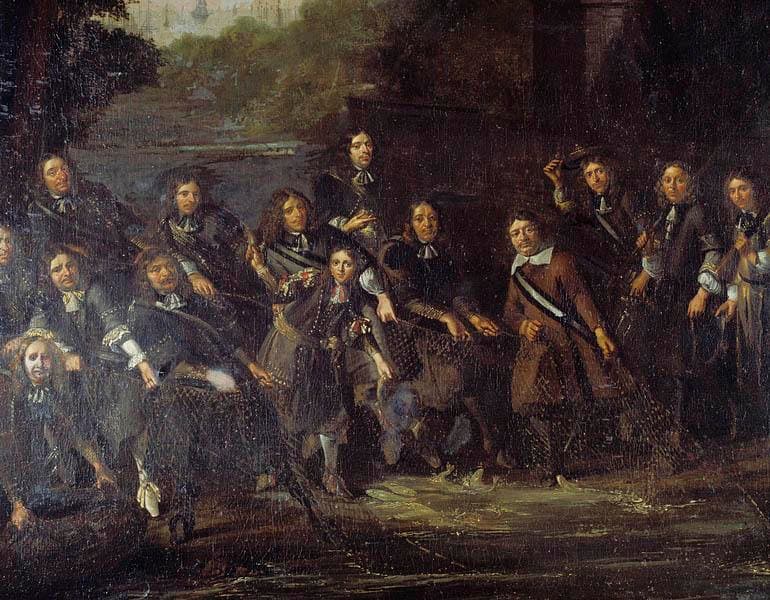 L'Amiral Ruyter et ses principaux collaborateurs sont en grand apparat et tirent des filets de pêche sur le rivage devant un fond d'architecture.
