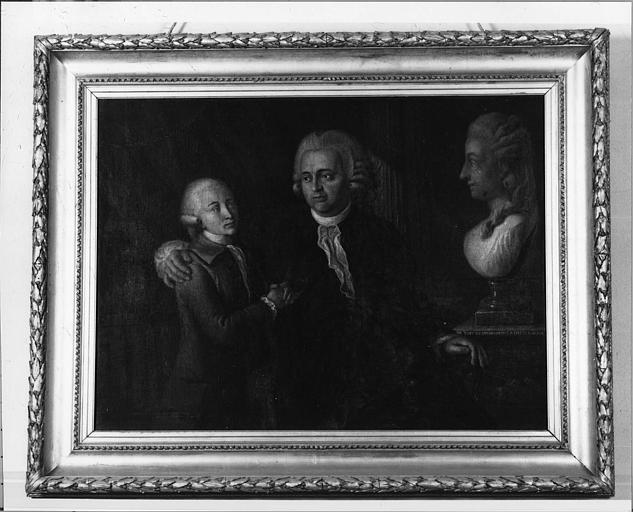 tableau et son cadre : Jean Baptiste Elie de Beaumont et son fils Arnaud devant le buste de Mme de Beaumont