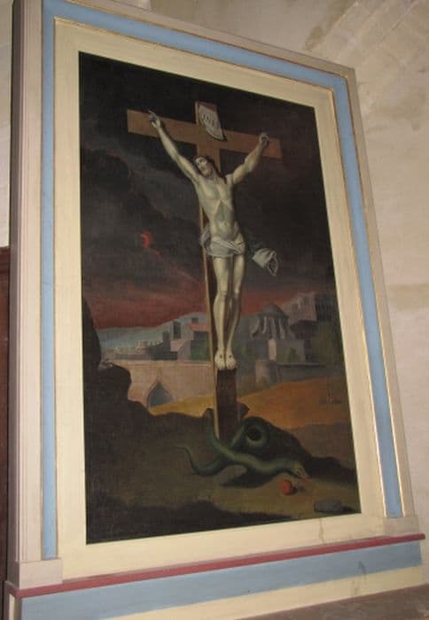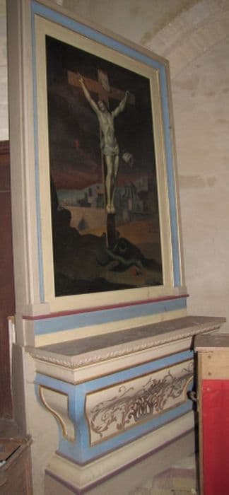 Le retable de l'autel secondaire sud, remplacé par un simple cadre rectangulaire mouluré, accueille une huile sur toile représentant le Christ en croix.
