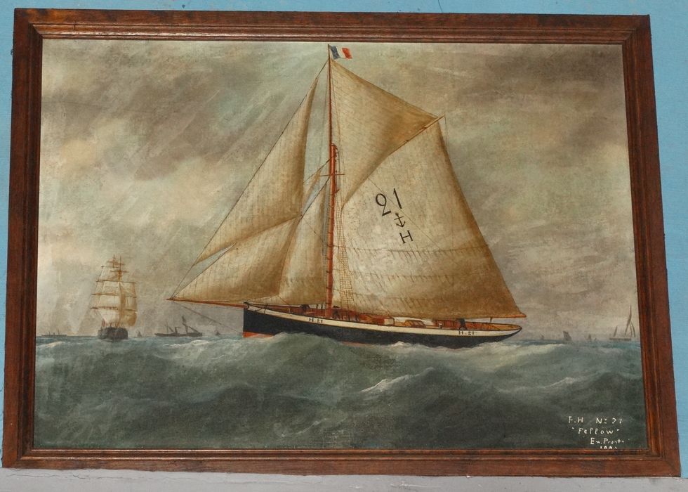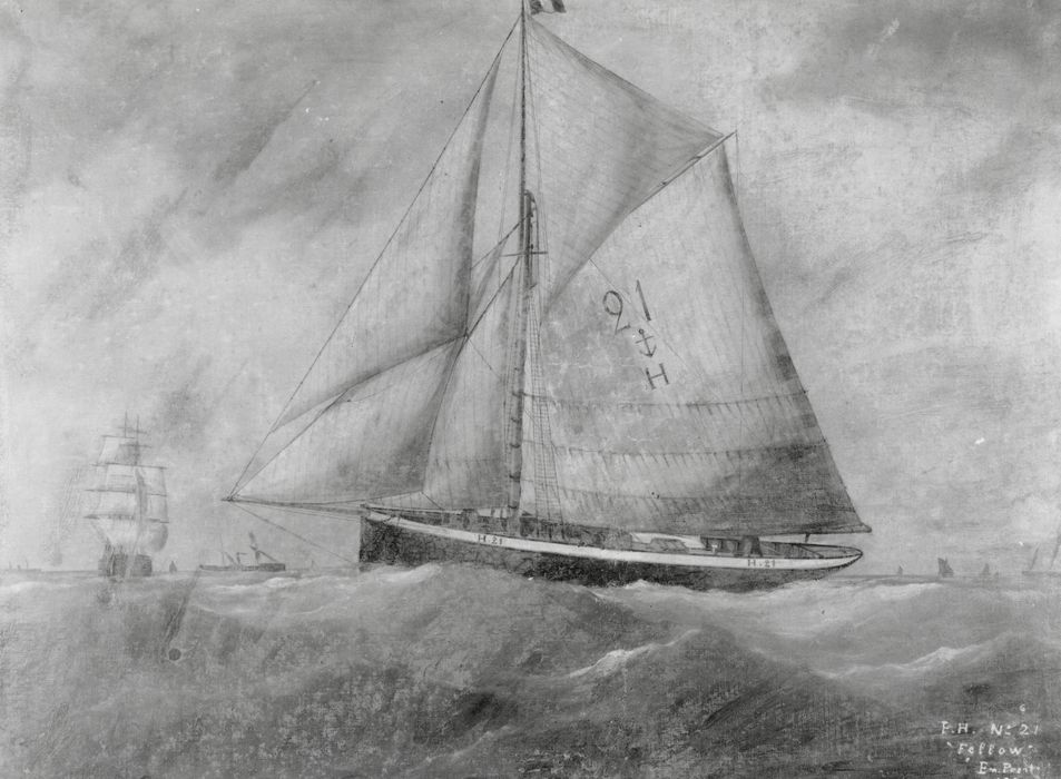 Inscription (sur la coque babord avant et arrière, et sur la grand-voile) : 21 ancre H ; inscription, signature et date (sur l'angle inférieur droit) : F. H. n° 21 "Fellow" Em. Prent. 1900".