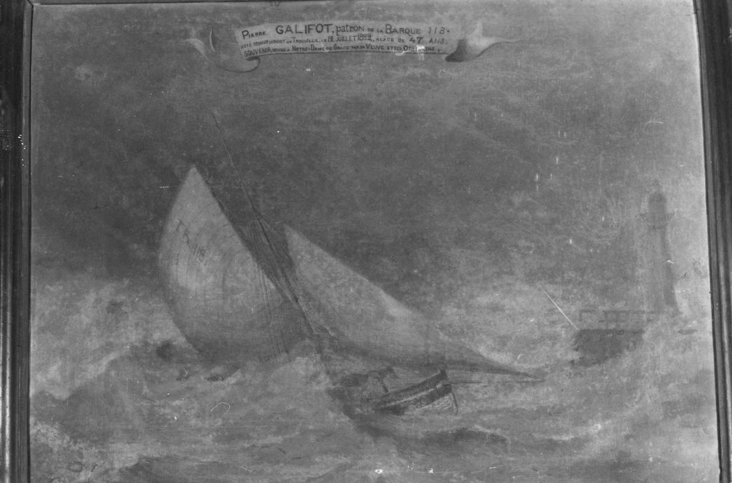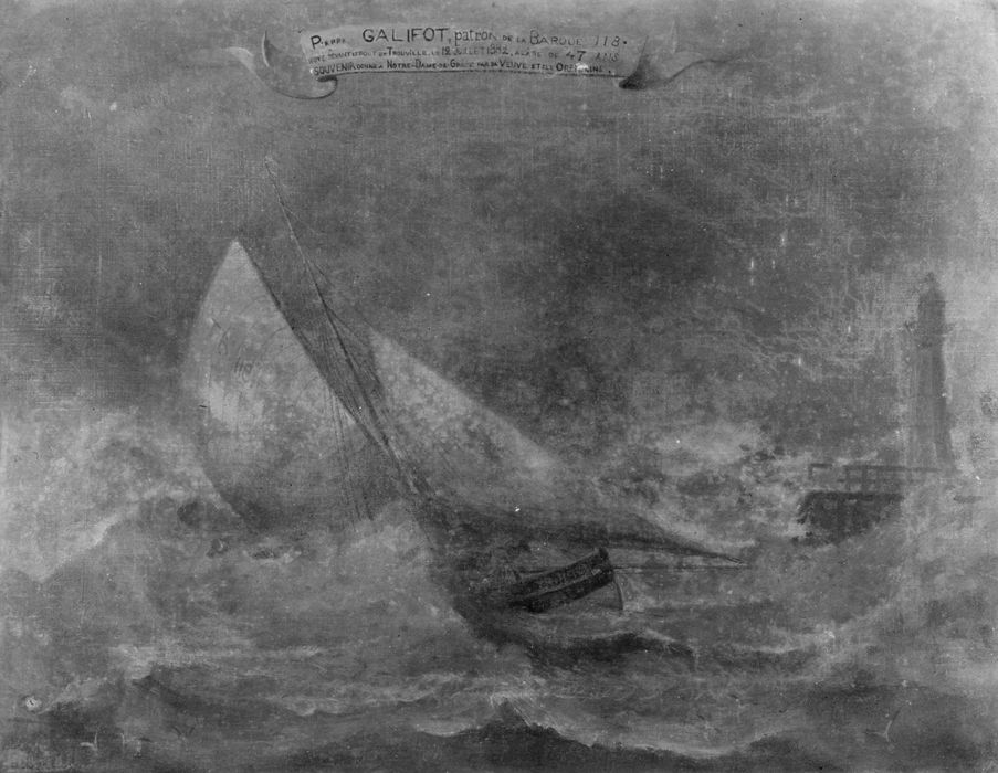Inscription (sur phylactère en partie haute de la toile) : Pierre Galifot patron de la barque 118 noyé devant le port de Trouville le 12 juillet 1882 à l'âge de 47 ans. Souvenir donné à Notre-Dame de Grâce par sa veuve et ses orphelins ; signature (dans l'angle inférieur gauche) : L. Bustelli Honfleur ; inscription (sur la coque tribord) : illisible.