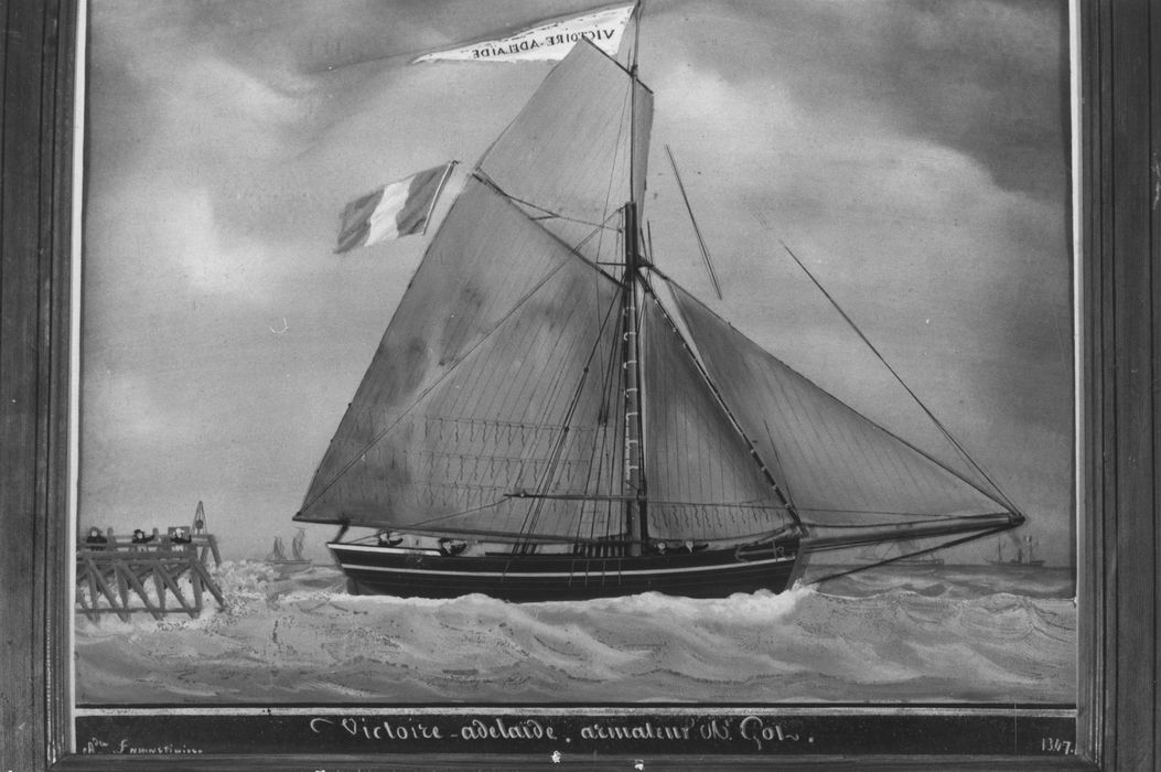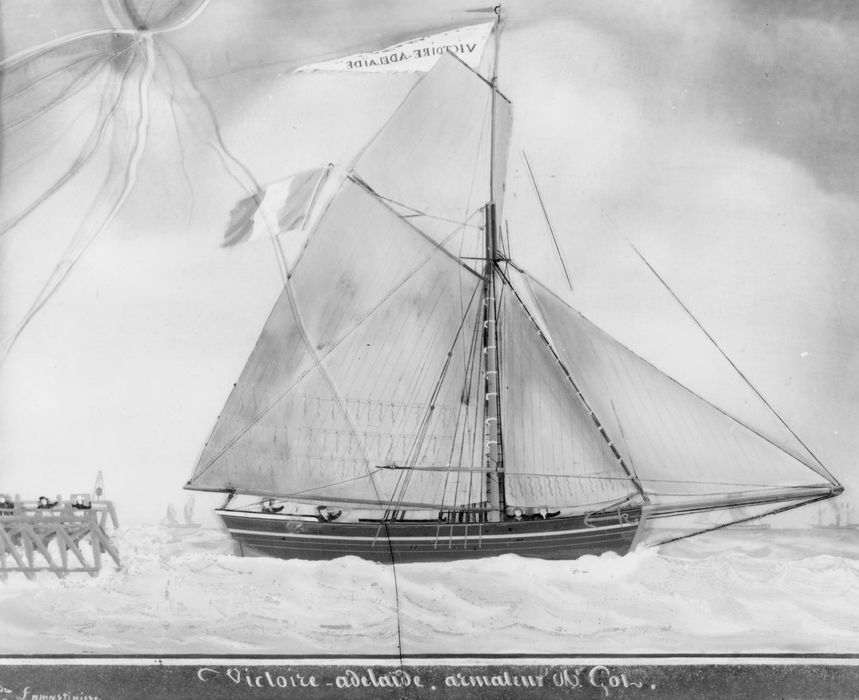 Inscription (sur bande noire en partie basse) : Victoire-Adélaïde armateur M. Got. A. Lamartinière 1847 ; Inscription (sur pavillon sur le grand-mât) : Victoire-Adélaïde.