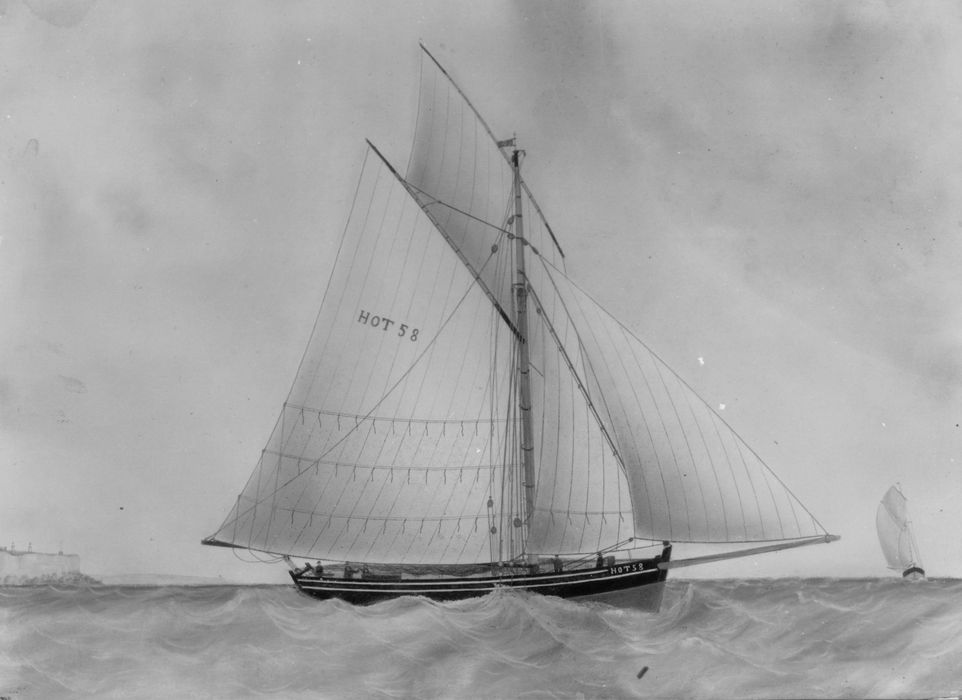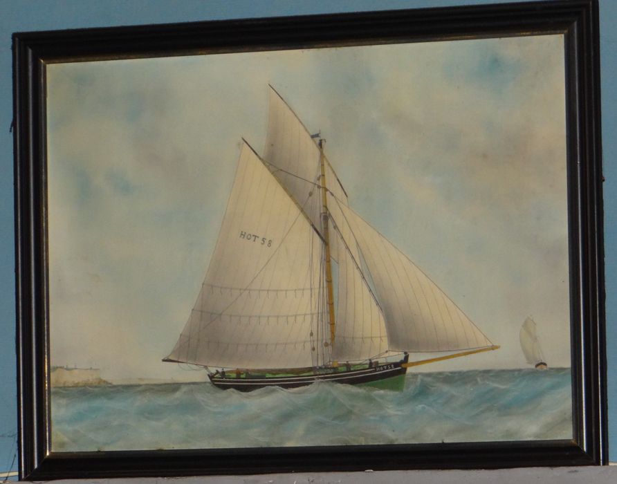 Cotre du commerce sur mer calme, quittant un port. On distingue en arrière plan gauche les falaises du pays de Caux et en arrière plan droit un autre voilier. Sur le pont : cinq personnages.
