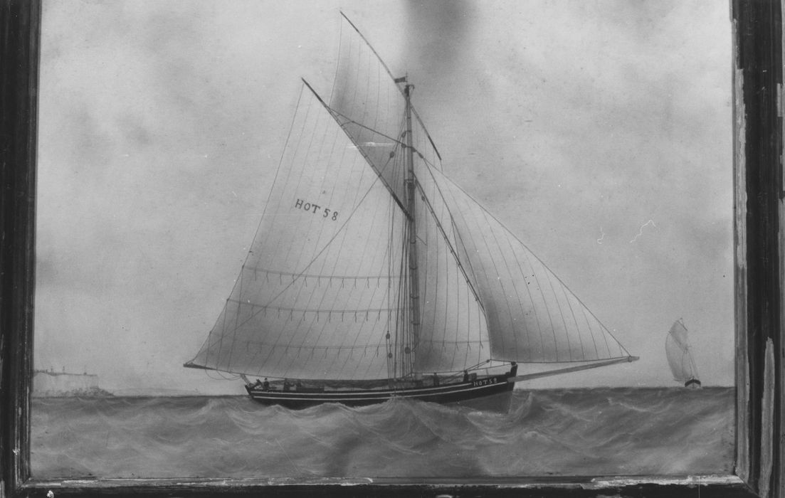 Inscription (sur la coque tribord et la grand-voile) : HOT 58.