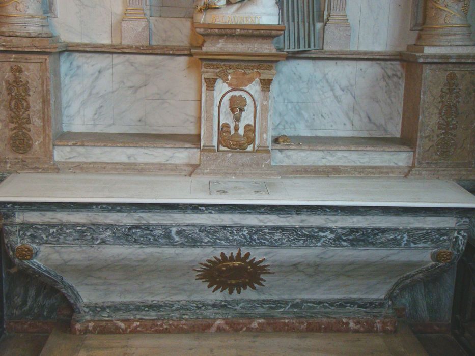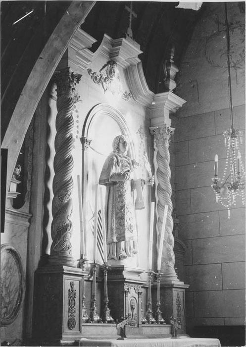 Retable en bois peint en faux marbre blanc veiné et anthracite veiné, formé de deux colonnes corinthiennes, torses, cannelées, lisses et agrémentées de pampres en relief dans leur tiers inférieur. Les colonnes reposent chacune sur un piédestal quadrangulaire orné sur le devant d'un trophée végétal central doré formé de rinceaux et de cartouches. Arrière plan des colonnes composé d'une parclose moulurée. Entrecolonnement composé d'une fausse niche en plein cintre mouluré, l'arc reposant sur des pilastres corinthiens. En partie haute, elle est flanquée de deux fleurons d'acanthe sculptés, desquels s'échappent deux rosaires de fleurs. Les colonnes soutiennent l'entablement composé d'une architrave, d'une frise dont le centre est trapézoïdal, et orné d'un angelot en haut relief souligné de rinceaux d'acanthe. Entablement se prolongeant par une corniche surmontée au centre d'une croix et dans le prolongement des deux colonnes, de pots à feux en forme de balustre de section carrée. Ailes du retable : à hauteur des piédestaux est un médaillon ovale mouluré surmonté de festons de draperie. L'ensemble est coiffé d'un fronton à cintre surbaissé coupé, surmonté d'un pot à feux, et se prolongeant pour rejoindre progressivement le retable. Cette partie est rehaussée d'une guirlande de fleurs en chute allant jusqu'à la corniche.