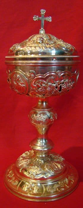 Ciboire sur pied circulaire. Cavet bordé de frises de perles. Décor de fleurs séparées par des réserves ornées de coquilles, de crochets et de feuilles d'acanthe. Terrasse ornée de cartouches ovales abritant des scènes religieuses. Tige balustre. Virole basse ornée de chapelets. Noeud allongé, renflé en partie haute, et orné de coquilles dans des lobes. Fausse coupe ajourée. Coupe sans décor. Couvercle bombé et galbé. Frise de perles et de petites torsades. Décor d'angelots sur les nuées, séparé par des pampres, des roseaux et des épis de blé. Croix sommitale fleuronnée.