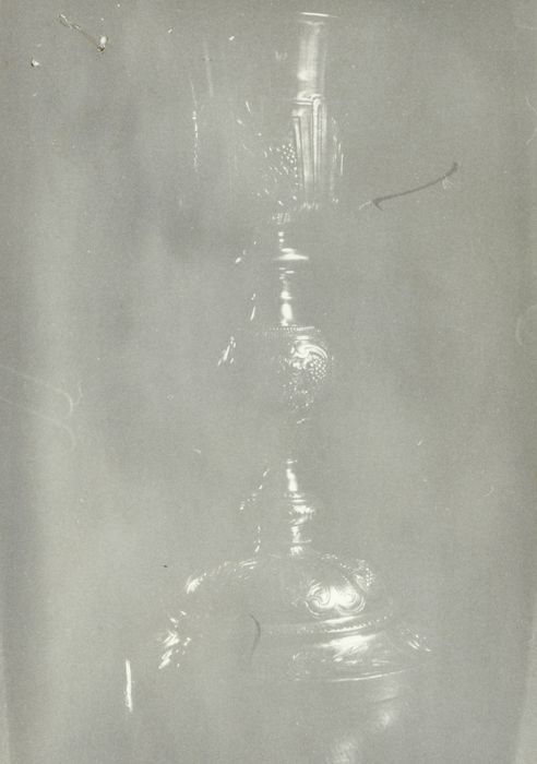 Le calice repose sur un pied base polylobé à décor ciselé de croisillons. Chaque lobe est délimité par l'extrémité de feuilles d'eau ciselée évasée. Dans chaque interstice se glisse un épi de blé stylisé en creux. Sur un des lobes, croix tréflée en relief. Tige à décor ciselé de feuilles d'eau en partie inférieure, avec collerette et noeud en torsade. Fausse coupe à motif de feuilles d'eau. Coupe sans décor.