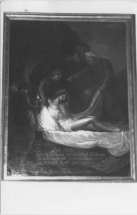 Inscription (peinte, en bas) : L an 1820 – Ces quatorze tableaux représentant le chemin - de la croix ont été peints par Noury - dans la 79e années de son âge ; Inscription (peinte, en bas à droite) : Priez pour le repos de l'âme de sa femme qui mourait pendant qu'il faisait cet ouvrage, priez aussi pour lui et pour ses enfants.