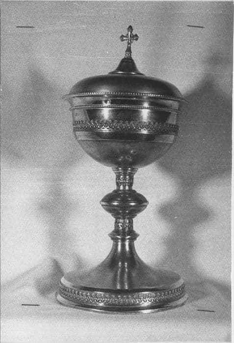 Ciboire avec couvercle surmonté d'une petite croix. Frises d'entrelacs ciselées sur le pied et la coupe. Assemblage par vis.