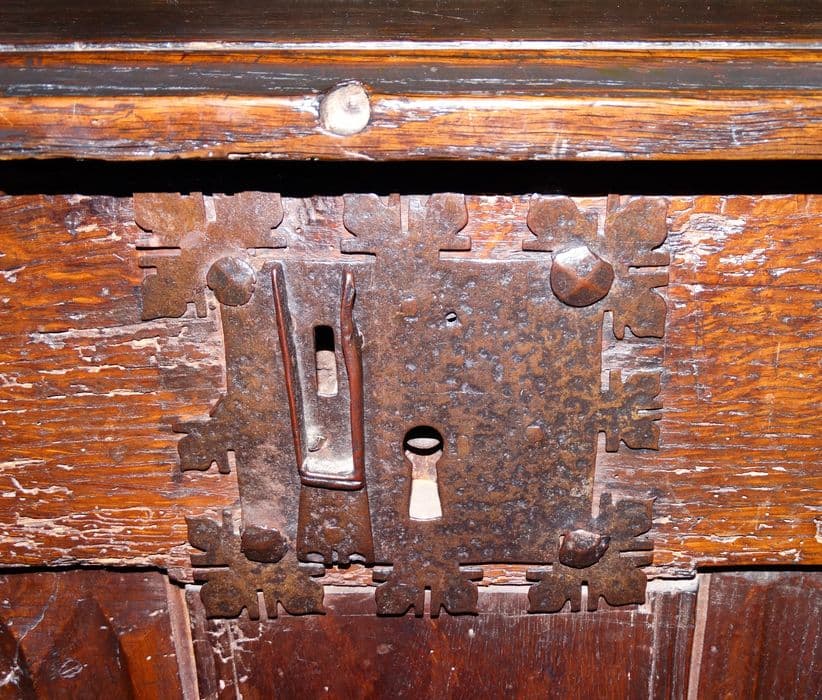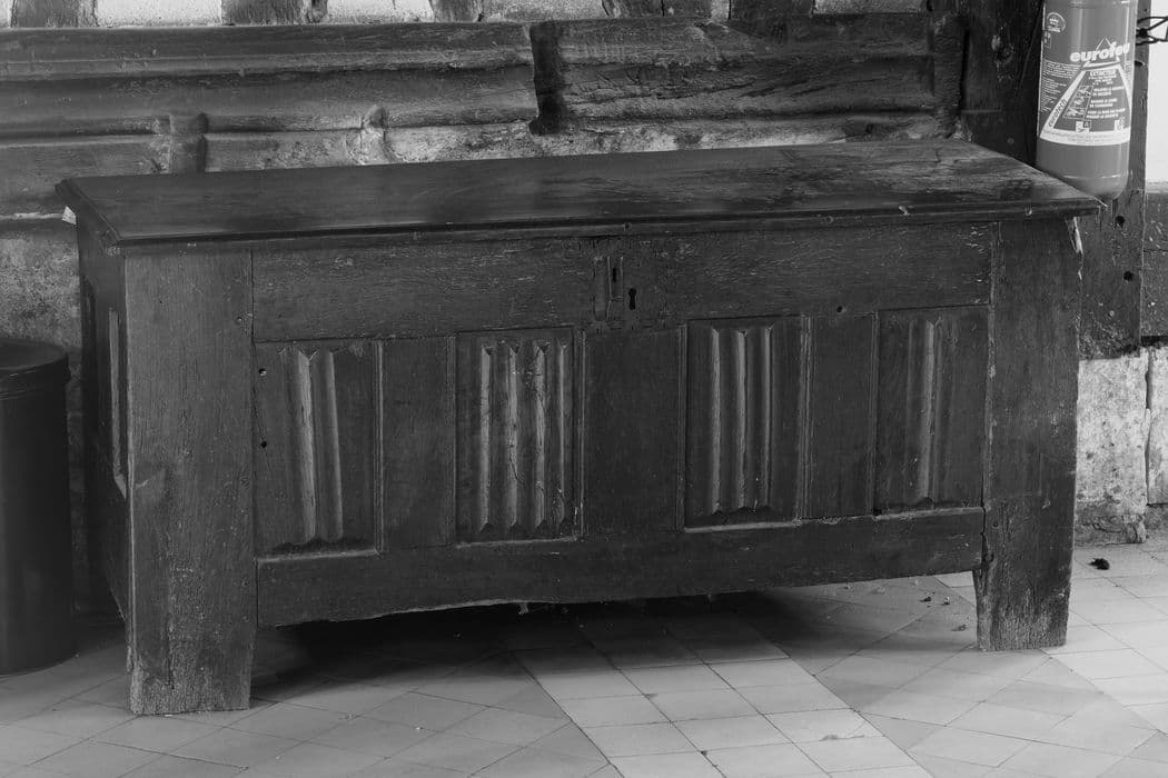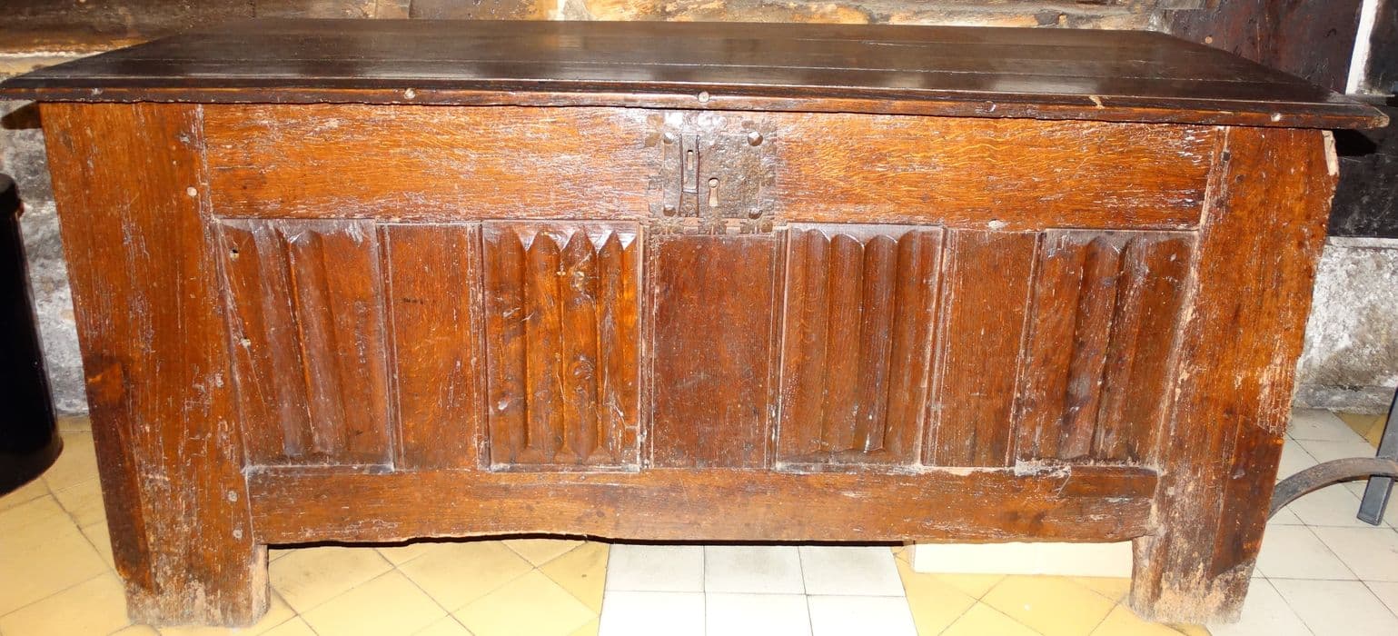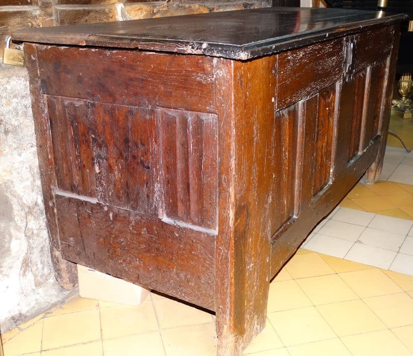 Coffre sur quatre pieds. Quatre panneaux sculptés façon plis de serviette en façade et deux panneaux sculptés sur les côtés. Serrure ancienne à deux entrées.