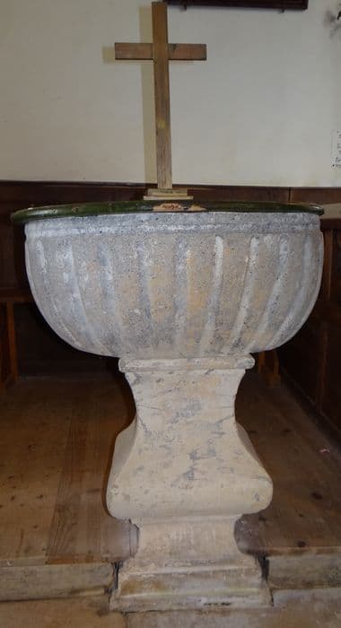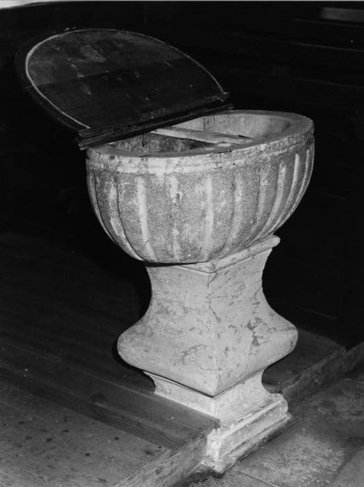 Fût en balustre. Cuve ovale à cannelures ; sur le bord intérieur, deux cavités pour recevoir les ampoules aux saintes huiles, marquées OC et SK. Couvercle en bois peint en vert, ovale, charnières ; croix latine fichée dans un degré.