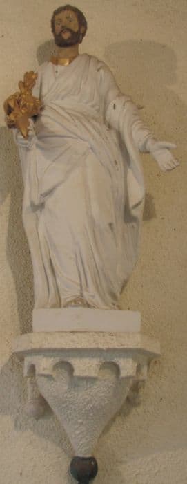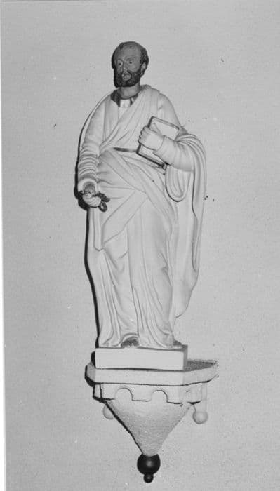 Plâtre blanc et polychrome / Stuc ? Choeur, mur est, côté nord. Main gauche : livre fermé. Main droite : clés. Toge ample. Socle : bulbe allongé godronné, frise de lambrequins dentelés.