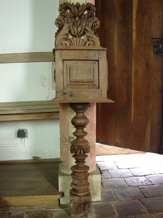 Tronc (?) comprenant un corps formé de quatre panneaux moulurés et d'un dessus percé d'une large fente, surmonté d'un décor ajouré de coquille et de fleurons, le tout reposant sur un pied unique en bois tourné, avec au centre un motif de drapé noué.